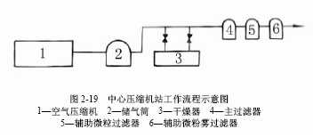 制備上述高質量的壓縮空氣使用中心壓縮機站,中心壓縮機站工作流程示意圖如圖2-19所示。空氣壓縮機1將空氣加壓到噴氣引緯要求的壓力,壓入儲氣筒2,空氣在壓縮過程中被加熱,大量的水分凝結為冷