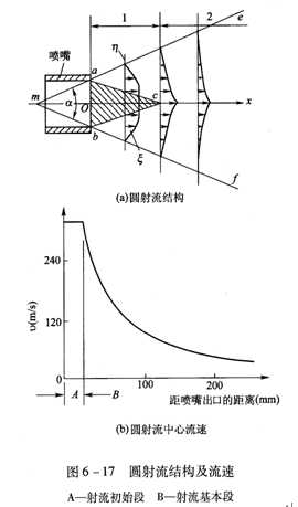 在射流的邊界,氣流除了存在沿軸線方向的運動外,還存在垂直于射流軸向的運動,由于噴出的氣流與周圍靜止的空氣之間存在速度梯度(速度差),所以靠近邊界的射流脈動微團,要與周圍的靜止空氣發(fā)生摻混,結果是射流將自己的一部分動能傳遞給周圍空氣,射流的流速因此而衰減,此為射流的擴散作用。同時,一部分原來靜止的空氣被射流帶著向前運動,即為射流的卷吸作用。在射流初始段,射流流速很高,負靜壓顯著,于是周圍的空氣在靜壓差作用下不斷流向射流,產生了明顯的射流卷吸作用。隨著射流流速的不斷衰減,這種卷吸作用將逐漸削弱。由于擴散和卷吸的共同作用使射流截面不斷擴大,流速迅速下降。射流中心的流速ν呈衰減曲線,如圖6—17(b)所示,其中ν0為噴嘴出口處中心點的流速。