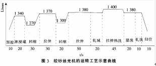 圖3是絲光機(jī)的運(yùn)轉(zhuǎn)工藝曲 線。 一個絲光程序總用時約為6 min(包括上下紗)。技術(shù)參數(shù)如下: 液堿濃度:260 g/I : 液堿溫度:(23±2)cc.需配備 足夠制冷量的液相交換冷凍機(jī)以 保證整個生產(chǎn)過程堿液溫度穩(wěn)定: 液堿滲透性:≤5 s(工業(yè)帆布 在堿液中的沉降時間).這項(xiàng)指標(biāo)對確保絲光紗的絲光鋇值均勻一致非常重要: