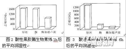 上述兩種試驗中原坯的、酸性果膠酶處理的以及酶加以超產波處理的三塊重復試驗樣的平均潤濕性(經+緯),分別表示于圖2和圖3中,