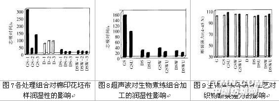 圖7~圖9表示堿性果膠酶生物煮練、退漿、后洗滌、超聲波及其相結合的處理對棉印花坯布潤濕性或斷強的影響。今加以分析討論如下: