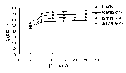 目前使用的淀粉類漿料主要是變性淀粉,各類淀粉酶對各類變性淀粉的分解程度有所差異,其排列次序為:原淀粉>非離子變性淀粉>陰離子變性淀粉>陽離子變性淀粉,如圖1所示(指分解為還原糖的量)。