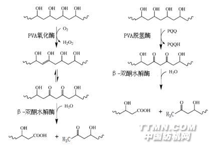 目前已正式報道的PVA 降解酶主要有三種:PVA氧化酶(仲醇氧化酶)、PVA脫氫酶和氧化型PVA水解酶(β-雙酮水解酶)。