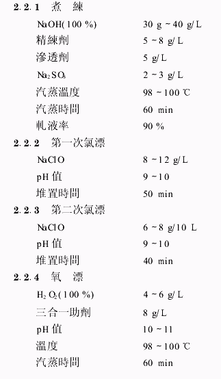 32 實(shí)驗(yàn)儀器及染化助劑臺(tái)灣瑞比公司產(chǎn)小軋車、小定型機(jī),自制小蒸箱,電熱恒溫水浴鍋,毛細(xì)管效應(yīng)實(shí)驗(yàn)儀;試驗(yàn)用染化助劑均由北京中紡化工有限公司提供。33 工藝方案新工藝的出發(fā)點(diǎn)是采用無(wú)鹼或低鹼工藝代替高鹼重煮工藝,因?yàn)樽畛踉O(shè)想的方案是:a將原工藝中的“燒鹼煮練”改為“純鹼煮練”,“氯漂+氧漂”改為“二次氧漂”。因?yàn)榧凔|比燒鹼鹼性弱,相對(duì)作用溫和;再者,不用氯漂可以減少氯氣等有害氣體的污染,對(duì)清潔生產(chǎn)有利。其中,純鹼煮練工藝的配方為: