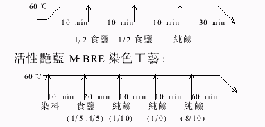配方:染料1%(o.w.f),浴比1︰25,食鹽30g L,用活性艷紅X 3B和活性艷藍KN R染色時純堿用量為10g L,用活性艷藍M BRE染色時則為20g L。活性艷紅X 3B和活性艷藍KN R的染色工藝: