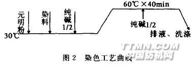 2.4 染色工藝選擇 染缸的升溫是通過蒸汽截止閥控制的,使用B型乙烯砜十一氯均三嗪雙官能團活性染料,該染料存在兩種活性基團,顯示良好的勻染性和重現性。 染色工藝曲線(見圖2)。