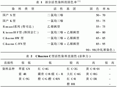 1.4 染料的選擇適用于冷軋堆染色的活性染料必須符合以下條件:-水溶性良好;-直接性低,便于前后色光控制;-染料的反應性、滲透性好;-耐堿性優良;拼混染料能夠同步上染、固色,色光穩定。根據以上要求和相應的性能要求,優化選擇染化料品種。曾有人探討了部分活性染料品種固色率的對比情況,表1即為部分活性染料品種的固色率。由表1可知,國產X型、K型染料固色率最低,染深性差,并且X型不易控制,易產生色點;國產K型易使布面產生色花,而國外進口品種固色率明顯提高,染深性提高較大。尤其是CibacronC/FN型染料用于冷軋堆染色時固色率高達90%~95%。目前國內新開發的活性染料,全部為2個或2個以上的活性基團,以一氯均三嗪縮合間位酯或對位酯為主,可用于棉的染色與印花,但固色率一般≤80%。國內稱為M型,有些稱為B型。