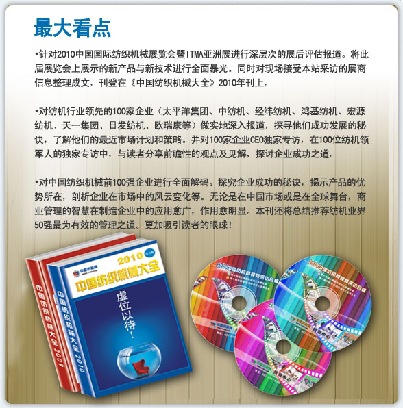 1、報告:對紡織機械行業年終總結及發展趨勢分析 2、展會:對2010中國國際紡織機械展覽會暨ITMA亞洲展進行深層次的展后評估報告 3、產品:全面展示行業高端產品,集精美圖片、詳細參數于一體 4、廠商:1200家優秀知名廠商詳細介紹 5、專訪:100位CEO獨家專訪,探討企業成功之道 6、百強:全面解碼紡織機械行業100強 7、技術:了解技術發展趨勢,搶占市場先機