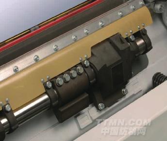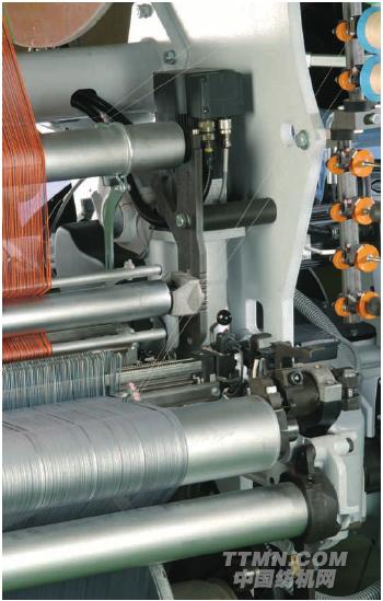 重新設計過的送經控制系統,保證了毛圈的勻稱性。根據動力學設計,這種新的帶有張力傳感器的擺動羅拉保證了經紗張力的直接重復讀取。在毛圈形成期間,系統的高靈敏度保證了張力在很大范圍的動態變化時經紗的正常運動,在鋼筘打緯時精確引導經紗運動。邊撐支架安裝在擺動滑塊上,與起圈裝置一起運動從而完成起圈,以避免經線松弛并保證布幅布面張力的一致。