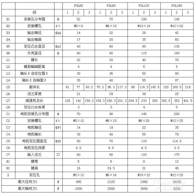特點:輸出端采用推力軸承,圓柱形外殼,體積小,結構緊湊,安裝簡便. 應用領域:主要使用在包裝機械、切割焊接設備、實驗機、專機設備、機床改造等行業。 技術參數:外形尺寸: 40mm---160mm 減速比: 3---512 傳遞力矩: 5Nm---895Nm 精密側隙: ≤5arcmin 安裝方式: 任意
