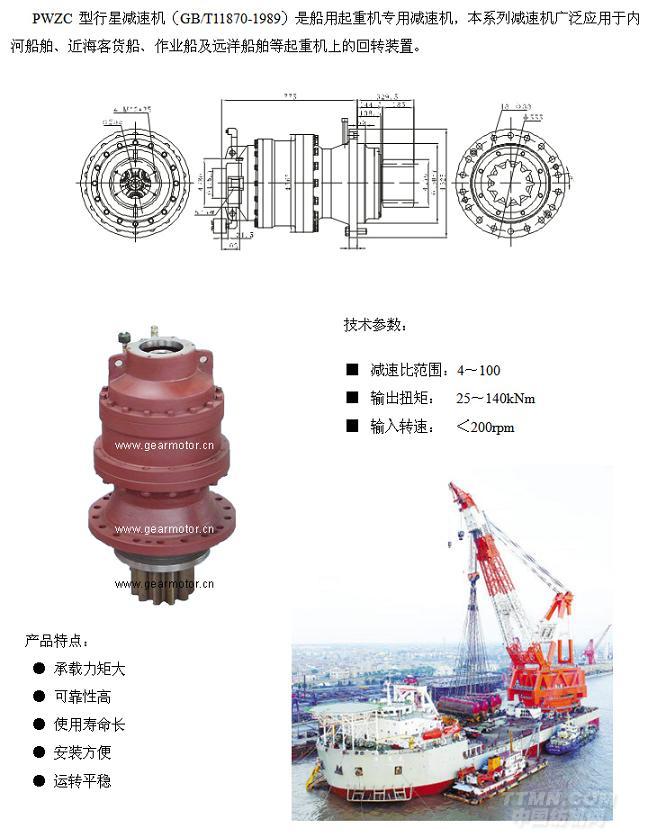 特點:承載力矩大、可靠性高、 使用壽命長、安裝方便 應用領域:本系列減速機廣泛應用于內河船舶、近海客貨船、作業船及遠洋船舶等起重機上的回轉裝置。 技術參數:減速比: 4---100 傳遞力矩: 25KNm---140KNm 輸入轉速:<200rpm 安裝方式: 垂直安裝