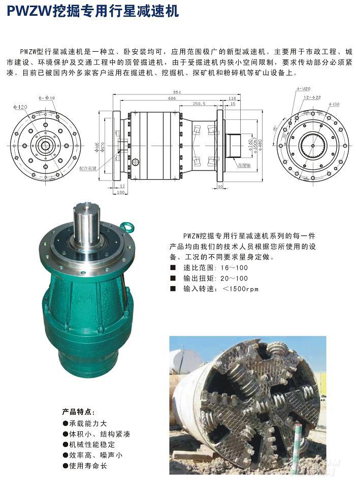特點:承載能力大、體積小、結構緊湊、機械性能穩定、效率高、噪聲小、使用壽命長 應用領域:本系列減速機主要用于市政工程、城市建設、環境保護及交通工程中的頂管掘進機,由于受掘進機內狹小空間限制,要求傳動部分必須緊湊。 技術參數:減速比: 16---100 傳遞力矩: 20KNm---100KNm 輸入轉速:…