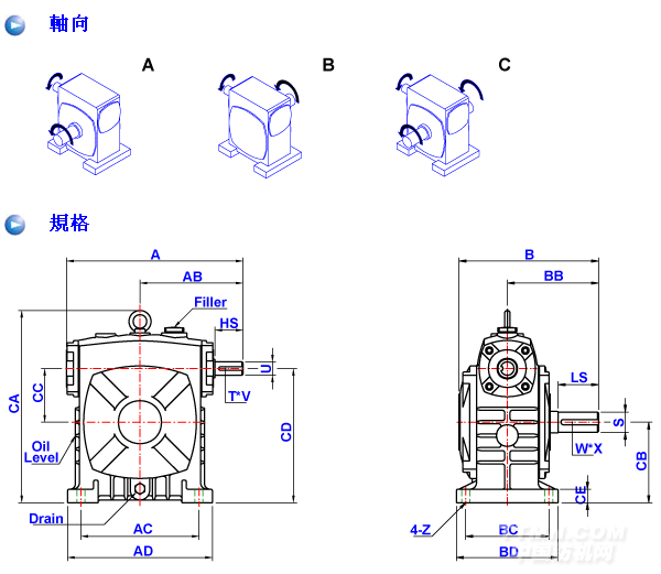 5、輸出、輸入軸位置方向有輸入軸在下及在上;輸出軸向上及向下;輸入軸向上及向下。