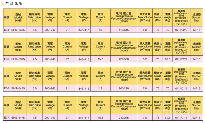雙段鼓風機EHS6355/6375產品規格:
