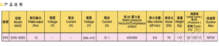 雙段鼓風機EHS8320風機特點:1.超靜音型,無噪音: 采用德國先進技術(shù),馬達直接運轉(zhuǎn),在通過加上一體式的銷音設施,改進了高壓風機噪音大的現(xiàn)像,從而達到靜音的效果。 2.可靠性高當使用情況變化時,機器仍可安全運轉(zhuǎn)。除了葉輪之外,高壓鼓風機沒有其他動作,因此可靠性之高幾乎免維修。使用獨一無二且散熱良好的精密外側(cè)軸承,因此它具有下列優(yōu)點:高壓縮比;軸承運轉(zhuǎn)溫度低;潤滑油脂壽命長;免保養(yǎng)。 3.安裝容易 配備齊全,可隨時安裝與使用,供壓縮空氣或用于抽真空,也可任意安裝于水平或垂直的方向。 4.無油無污染 葉輪旋轉(zhuǎn)時,不與任何部分零件接觸,免潤滑,因此可保證百分之百無污染。 5.最高品質(zhì) 經(jīng)過17年的專業(yè)制造經(jīng)驗,最精密機械設計加上慎重電機配合標準儀器測試,使用所有零件均能達到最高品質(zhì)要求,運用標準ip54,f級馬達效率高,故障極少,馬達與鼓風機之間有軸封分試,預防異物進入。同時為確保功能效果,每一臺鼓風機在出廠前均經(jīng)過嚴格測試。 6.電壓:萬國電壓型,50HZ 60HZ均可用,無論您的產(chǎn)品是出口至歐美的使用60Hz,高電壓的國家,還是中東,非洲等使用50Hz電壓的國家及地區(qū),此款環(huán)保風機均能達到要求,功能產(chǎn)齊全,讓您無后顧之憂! 適用范圍:環(huán)保工程 產(chǎn)業(yè)機械,塑膠機械(除濕干燥機),印刷機械(絲網(wǎng)印機),照相制版,pcb設備,電器設備,醫(yī)療設備,各式燃燒機,鍋,環(huán)保養(yǎng)殖業(yè)等等