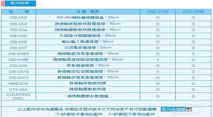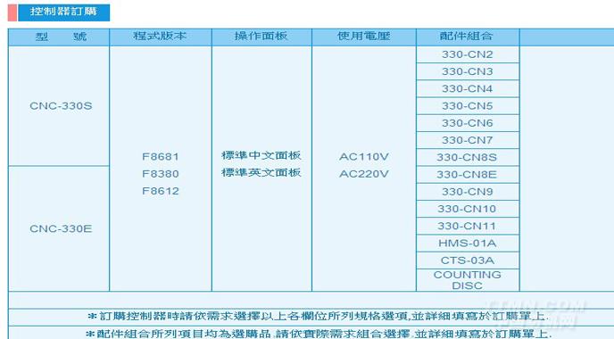 一、臺麗繞線控制器CNC330是本公司專門為繞線機開發的功能非常強大的新型微電腦控制器,該產品由從事繞線機制造行業的專業人士開發與設計,摒棄了傳統LED顯示模式,采用最新大屏幕 LCD 中文漢字顯示系統,操作簡單、直觀,適合繞制復雜的、步序數較多的產品,獨特的文件庫,使用戶繞線資料更方便管理。主控單元采用了大規?,F場可編程邏輯陣列CPLD技術,性能可靠、工作效率高。CNC-300AS是基于CNC-300A開發的伺服版繞線機控制器,此新型控制器保留了原版本成熟的技術與穩定的性能,由于直接控制伺服驅動器,精密度和工作效率更高、人機界面操作更便捷,是自動繞線機理想的選擇。二、主要特點1.大屏幕192×64點陣式LCD,中文漢字顯示。 2.采用CPLD技術,可靠性高、抗干擾能力強。 3.采用 FLASH ROM 能存儲 100 種(999 段)繞線資料,每個繞線資料分別命名,可隨時調用其中任何一種繞線,掉電后資料不會丟失。 4.只需輸入簡單參數即可自動生成繞線資料,操作快捷、簡單,使步序繁多的產品設置更加方便。 5.具有斷電記憶功能,繞線過程中突然斷電,可記錄當前的狀態、參數并保存,待上電,啟動繼續繞制產品,減少原材料浪費。 6.繞線軸直接控制伺服驅動器,精度、效率高,加、減速斜率可設定。 7.排線軸、轉角軸步進馬達提供0—99段速度選擇。 8.主軸位置、排線軸參數可用調校方式設定,調試設備方便。 9.故障自動判別功能,設定參數或繞線中產生錯誤,自動提示錯誤位置。 10.兼容性強,可直接替代同類型控制器或PLC。 11.程序可提供免費升級。三、技術指標1.繞線資料項目:產品名稱:表示一個繞線資料名稱,設定范圍 ≤10個數字、英文字符。 步 數:用于指定一個產品需要幾步繞線動用方可完成,每一個步序包含以下“轉速”至“自動定位”共14個項目,可存儲100種繞線資料,共999個步序,設定范圍1 — 99步。轉 速:高速繞線時的速度,設定范圍0 — 9999轉/分鐘慢 車:啟動后繞線軸先以低速卷繞的圈數,設定范圍0 — 999圈。線 徑:線材的直徑,設定范圍0 — 9.999毫米。加 速:繞線軸由低速上升至高速所需的上升時間,設定范圍0 — 9.9秒減 速:繞線軸由高速下降至停止所需的下降時間,設定范圍0 — 9.9秒 起 繞 點:排線桿原點至繞線點的距離,設定范圍0 — 9.999毫米。圈 數:所要卷繞的總圈數,設定范圍0 — 9999圈,0 — 359.9度,分辨率0.1度。繞 幅:線材卷繞排線的寬度,設定范圍0 — 9.999毫米。繞線方向:用于指定順時針或逆時針繞線,設定范圍(正時針/逆時針)排線方向:用于指定排線的方向,設定范圍(↑ / ↓) 自動啟動:用于指定執行該步序是否要自動繞線,設定范圍(√ / ×) 后 退:設定排線軸位移至后退位置進行轉角動作,設定范圍0 — 999.99毫米。轉角角度:設定轉角軸步進馬達旋轉的角度和方向,設定范圍0 — ±9999.9度自動定位: 保留,設定范圍(√ / ×)2.工作環境 電源輸入: 175V—240V 50Hz 2A 環境溫度: -10℃ — +40℃ 工作環境: 無水滴、蒸氣、灰塵及油性灰塵,且通風良好。
