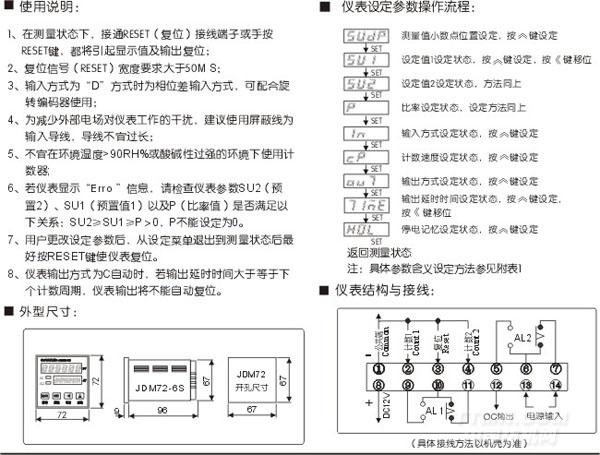 JDM72-6S計(jì)數(shù)、計(jì)米器以人性化、智能型為設(shè)計(jì)理念,內(nèi)含微處理器, 計(jì)數(shù)/預(yù)置數(shù)雙排LED顯示,設(shè)計(jì)先進(jìn)、功能強(qiáng)大、抗干擾能力強(qiáng)、計(jì)數(shù)精度高、讀數(shù)直觀;并具有以脈沖當(dāng)量為系數(shù),設(shè)定對(duì)應(yīng)計(jì)數(shù)值(即長(zhǎng)度單位)可對(duì)計(jì)長(zhǎng)精度進(jìn)行精確修正的先進(jìn)計(jì)長(zhǎng)、計(jì)數(shù)功能。此外本計(jì)數(shù)器還具有下列先進(jìn)功能: