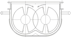 其外殼采用底部為圓形,上部為矩形,殼內排列有2-4根空心攪拌軸,軸與殼體間有密封端蓋。上蓋體