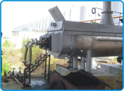 用螺旋輸送器或皮帶輸送機將含水率在80%-86%的脫水或壓濾后的污泥送至干燥機的進料口 使用蒸汽或導熱油作熱交換的熱源,熱載體(蒸汽或導熱油)的溫度為180-230℃,熱載體被分別引入中空的干燥機殼體和傳動的軸、漿葉等所有與污泥接觸進行熱交換的加熱金屬表面。