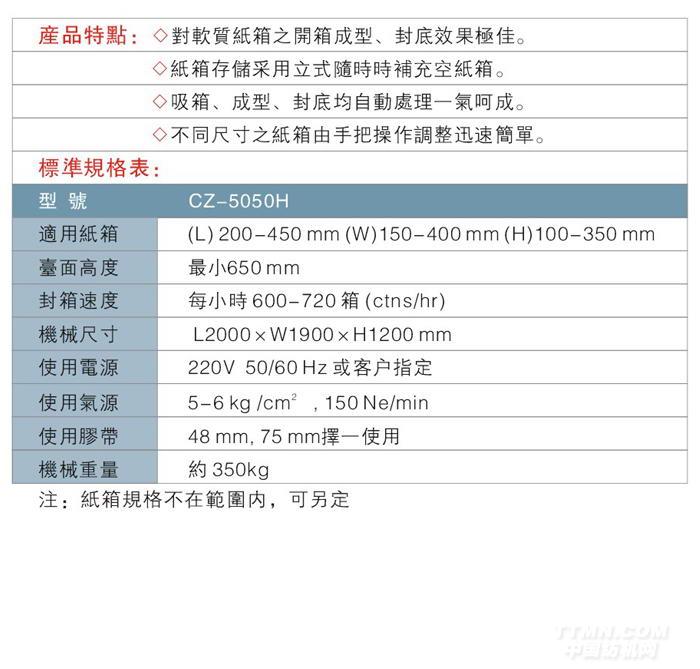您所在的位置:紡機(jī)網(wǎng) >> 正洲包裝機(jī)械(東莞)有限公司 >> CZ-5050H 立式紙箱自動(dòng)成型封底機(jī)