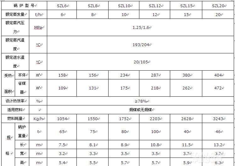 SZL雙鍋筒縱置式鏈條爐排蒸汽鍋爐主要技術參數: