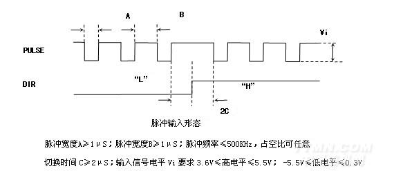 如果驅(qū)動(dòng)器輸入信號(hào)為電壓信號(hào),要求:3.6V≤高電平≤5.5V;-5.5V≤低電平≤0.3V,最常用的為TTL電平。如果驅(qū)動(dòng)器輸入信號(hào)為電流信號(hào),要求:7mA≤高電流≤18mA;-18mA≤低電流≤0.2mA。脈沖信號(hào)的頻率要求不大于500KHz;脈沖信號(hào)的寬度要求不小于1μS;脈沖信號(hào)的驅(qū)動(dòng)電流要求為7-18mA。