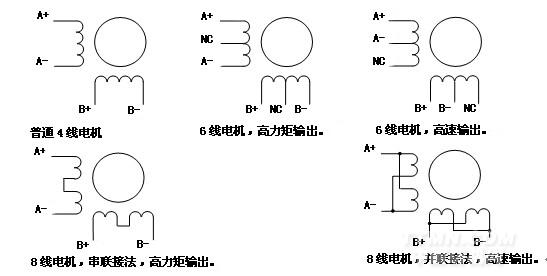 本品適合驅(qū)動(dòng)相電流在8.28A以下4線、6線或8線的任何一款兩相或四相步進(jìn)電機(jī)。電機(jī)繞組接線共有五種接法,見下圖: