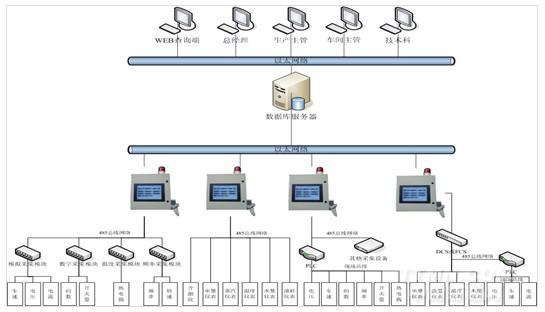 ①數(shù)據(jù)采集設(shè)備——對車間設(shè)備連接的參數(shù)傳感器進行數(shù)據(jù)采集,為現(xiàn)場監(jiān)控終端提供數(shù)據(jù)來源。采集設(shè)備主要包括:車速碼數(shù)采集模組、溫度采集模組、縫頭采集模組、門幅采集模組、含潮率采集模組以及能源(水、電、汽)數(shù)字儀表等。