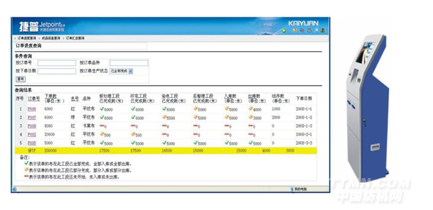 2)客戶自助終端——在樣品陳列室或客戶接待室,設(shè)置客戶自助查詢終端;或者在企業(yè)網(wǎng)站上開設(shè)查詢頁面,客戶可以通過自助查詢終端或互聯(lián)網(wǎng)查詢自己訂單的實時生產(chǎn)進度、查看成品的驗布報告、查看歷史訂單等。
