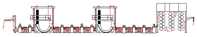平幅進(jìn)布→浸漬→三輥軋車→水洗→二輥軋車→J型箱→水洗→二輥軋車→水洗→二輥軋車→水洗→三輥軋車→水洗→二輥軋車→J型箱→水洗→二輥軋車→水洗→二輥軋車→水洗→ 二輥軋車→水洗→三輥軋車→烘燥→平幅落布