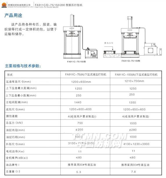 您所在的位置:紡機(jī)網(wǎng) >> 邯鄲紡織機(jī)械有限公司(邯鄲宏大化纖機(jī)械有限公司) >> FA911C-75.150 型液壓打包機(jī)