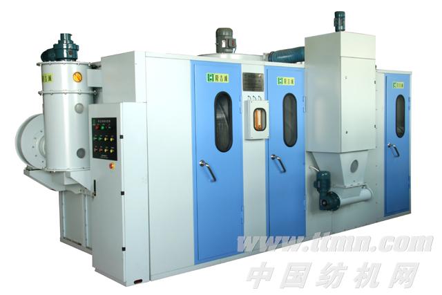 一、 產品用途:該機可用于棉、麻、毛、化纖等行業的空調濾塵系統,過濾和收集空氣中的纖維粉塵,以達到凈化空氣的目的二、 結構特點:1、 占地面積小,在處理風量較大時,占地面積可比其它濾塵設備減少約為15%.2、 采用不銹鋼絲風和長毛絨二級過濾,纖維與短絨和粉塵分別回收,提高纖維的利用率。3、 濾筒部件由多個直徑大小不同的錐形筒體及插片式濾料網板組成,結構簡單新穎,更換濾料方便、快捷。4、 采用長毛絨濾料,阻力小,過濾效率高,阻燃5、 濾料由網板支承,不會鼓起,保證集塵吸嘴貼附于小料,吸塵可靠,效果好。6、 吸嘴部件由多個可調吸嘴和吸塵管組成,每個濾筒內采脾雙吸嘴吸塵,從而縮短了吸臂往復運動的行程,清潔速度快。7、 二級傳動機構只由一臺減速機傳動,采用皮帶傳動方式,通過簡單實用的往復絲杠巧妙地將單一的加轉運動抽象成旋轉加往復的復合運動。從而滿足吸嘴的動作要求。整個傳動機構及控制電路簡單可靠,故障率低。三、 結構及工作原理:1、 多筒式除塵機組是由第一級圓盤預過濾器和第二級多筒式濾塵器構成的機電一體化的除塵機組。第一級圓盤預過濾器主要過濾、分離、收集被處理空氣中的纖維和雜質。第二級多筒式濾塵器主要過濾:分離、收集第一級過濾后空氣中的微細纖塵和粉塵。2、 工作時,本機在塵室內與主風機放在一起,在主風機抽吸作用下,塵室外呈負壓狀態,含塵氣流從入口進入本機,首先通過一級圓盤濾網,纖維和雜質被阻留在濾網上,旋轉吸嘴利用排塵風機的風力,將纖維和雜質吸除,通過纖維壓緊器分離,壓緊排出,分離后的含塵空氣返回一級箱體內,細小粉塵進入二級多筒式濾塵器,被吸附到濾料內表面,由旋轉吸嘴吸入布袋集塵器進行塵氣分離,采用新型機械震蕩裝置定時落灰,粉塵通過粉塵壓實器,壓緊排出。分離出的含塵空氣透過集塵布袋排回二組級箱體。經過過濾的潔凈空氣透過濾筒排到機外。本機組也可正壓運行。