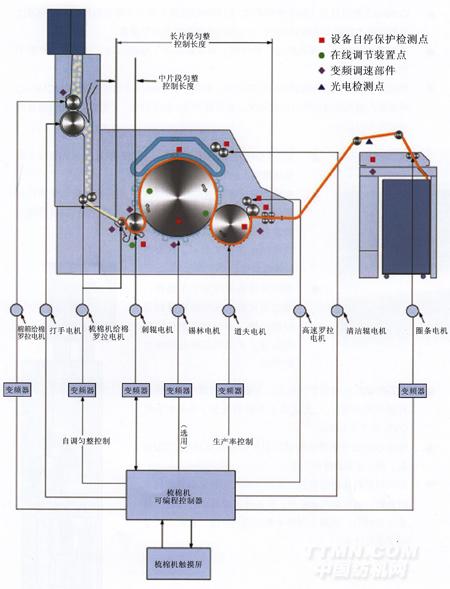 對錫林、道夫、刺輥、給棉羅拉、圈條、棉箱實(shí)行變頻調(diào)節(jié)。