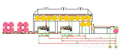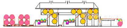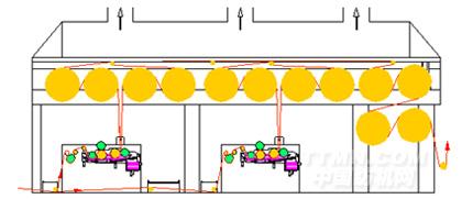 ASGA365E型漿紗機工藝流程示意圖(高架對角布局預烘烘燥機構+雙浸四壓式上漿機構)