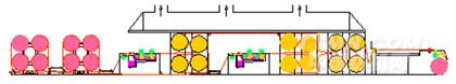 采用高架對角布局預烘烘燥機構(專利號: )。由于預烘烘筒位于漿槽的側上方,有效減少了出漿槽濕紗長度,同時節省了設備安裝場地。