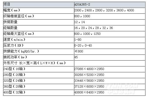 ASGA365型兩單元傳動雙漿槽漿紗機主要規格及技術參數