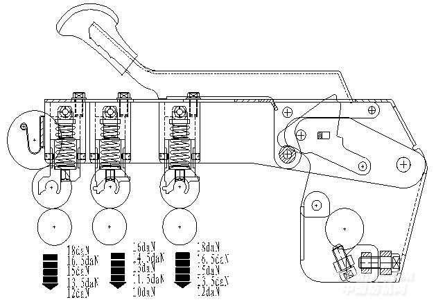 直壓式彈簧加壓搖架把傳統的彈簧加壓搖架的四連桿-加壓桿加壓改為三檔皮輥直壓式彈簧加壓,彈簧壓力直接作用于皮輥上,取消了加壓桿和連桿結構,三檔皮輥壓力可獨立直接調壓