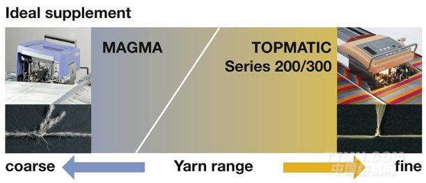 TOPMATIC 適用于各類標(biāo)準(zhǔn)和高支數(shù)紗,而MAGMA特別適用于從粗到中支紗的經(jīng)紗,以及產(chǎn)業(yè)用紗。