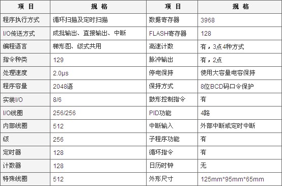 具有DC輸入的PLC,可設(shè)定其3個(gè)輸入點(diǎn)(I0-I2)為高速輸入點(diǎn);更 可設(shè)置PLC具有外部中斷,脈沖捕捉,輸入濾波功能。 高速計(jì)數(shù)最高速度為5Kcps;脈沖捕捉最窄脈寬0.1ms;輸入濾波 最大時(shí)間99ms