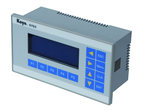 GT03是光洋開發的新一代圖形方式顯示設定單元,以串行通訊方式與PLC連接,通過GT03,可以實現指示燈顯示,棒圖、趨勢圖顯示,數據監視、設定,報警信息顯示等功能。GT03支持RS-232C或RS4855通訊連接,RS485方式下支持連接多臺PLC。