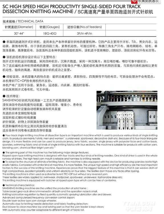 >> SC高速高產量單面四跑道剖開式針織機